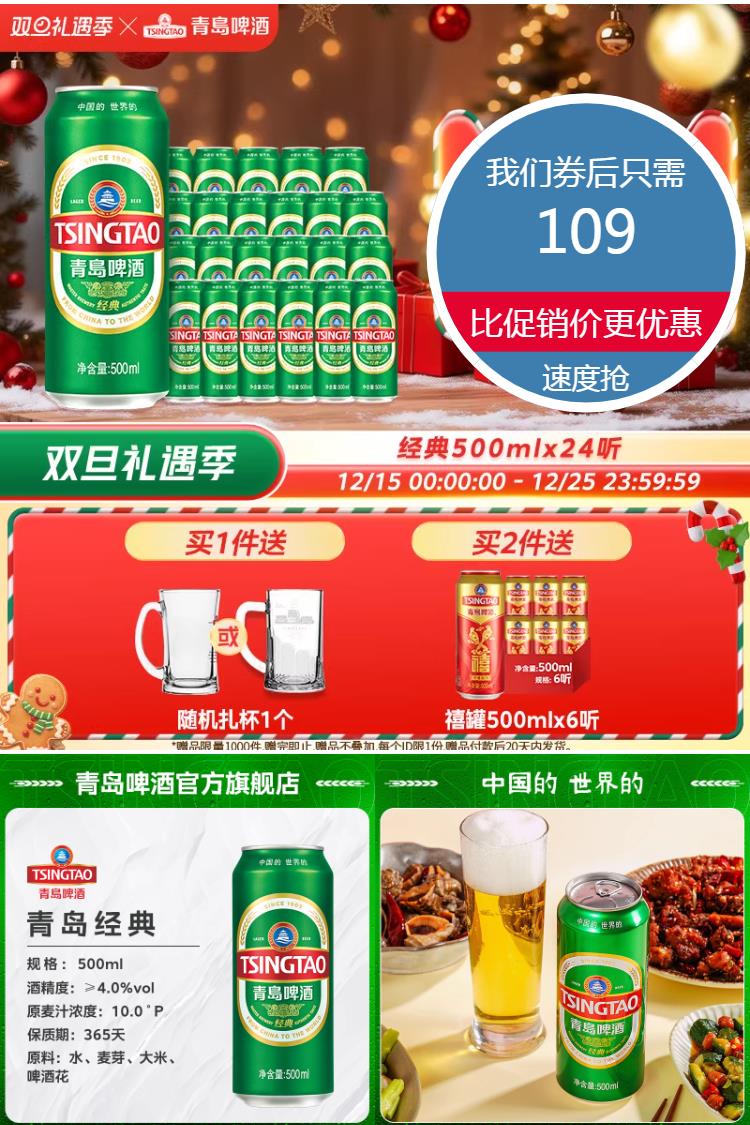 ⭕【送扎杯】青岛啤酒经典500ml*24听