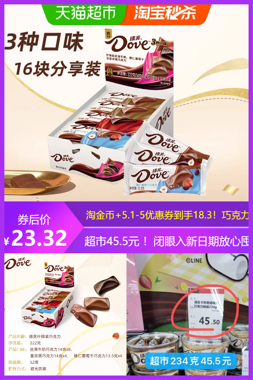 【超市一碗都45.5啦!淘金币+5.01-5元优惠券到手18.32】经典的牛奶巧克力、香浓的黑巧克力,每一种味道都是精心制作,一口咬下,各种风味在口中交织,令人回味无穷~