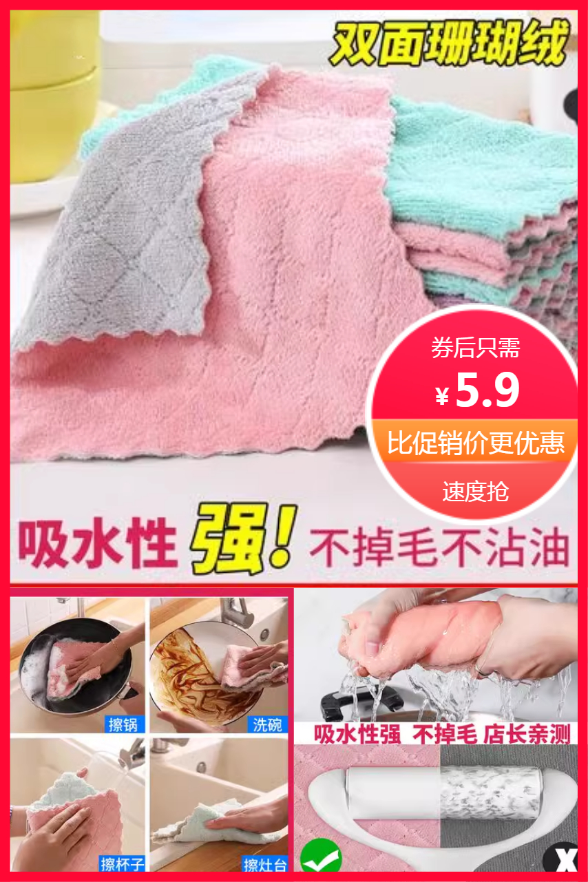 这个洗碗抹布真的超级好用!!双层加厚印花珊瑚绒,柔软细腻,易清洗,轻松去油,不留痕迹,强效吸水,柔软舒适,贼细密,不掉毛,吸油不挂油,厨房清洁好帮手!!