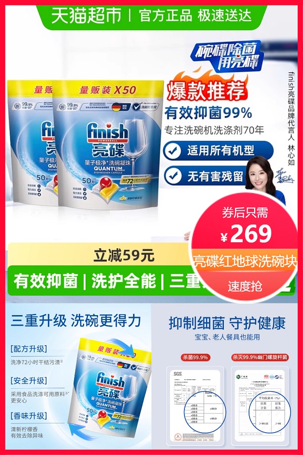 超市立减59元+券40元+88vip省13.45元+红包8元+淘金币抵扣11.04元后约236.51元,全机型通用,轻松解决顽固污渍,无残留,强力清洁,一颗搞定,宝宝老人餐具都能洗,抑制细菌传播,守护家人健康!安心使用